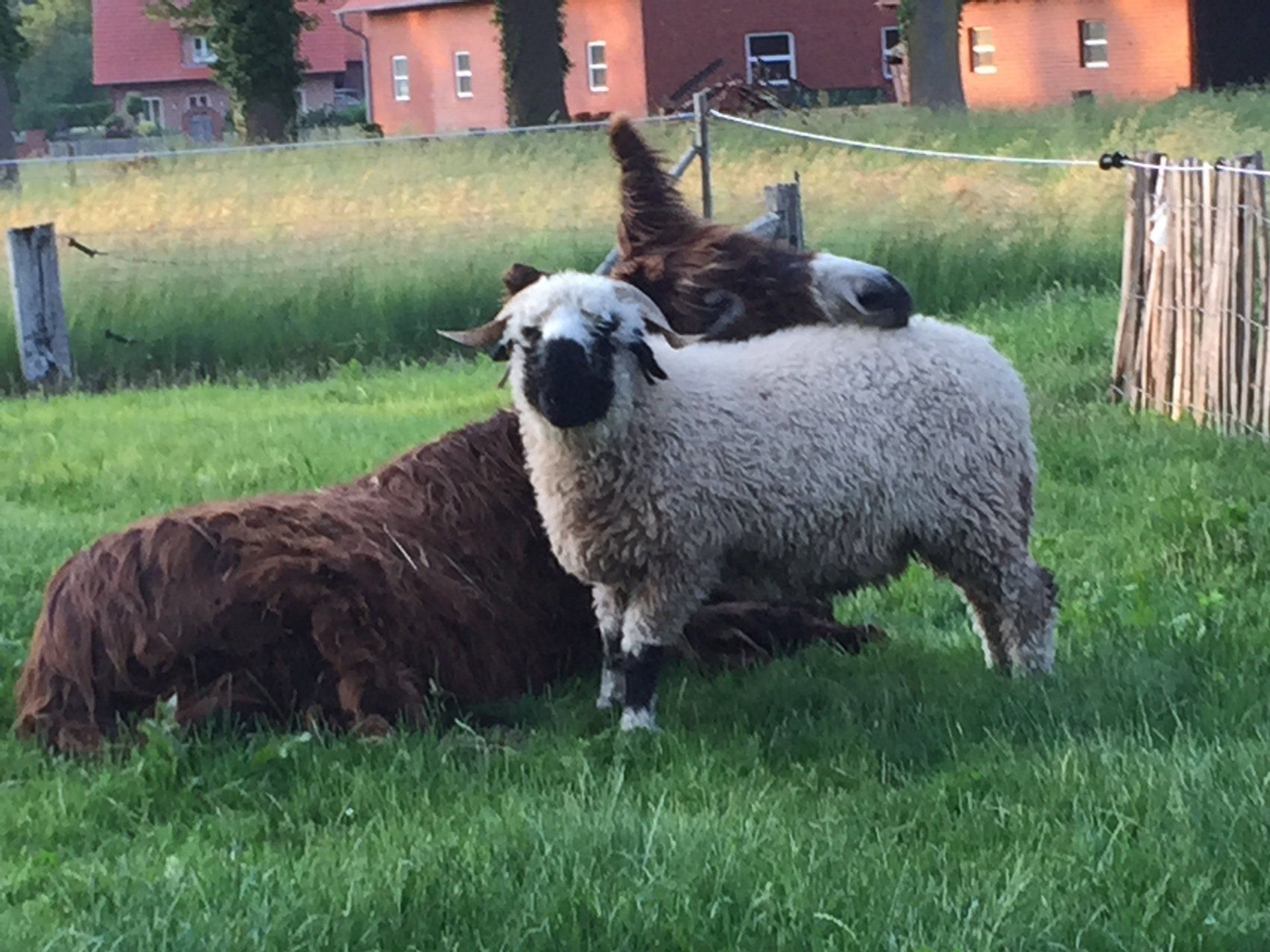 Auf unserem Hof leben die Poitou Esel "Hulotte", "Indi" und "Ombeline", eine Herde Walliser Schwarznasenschafe und viele bunte Hühner.